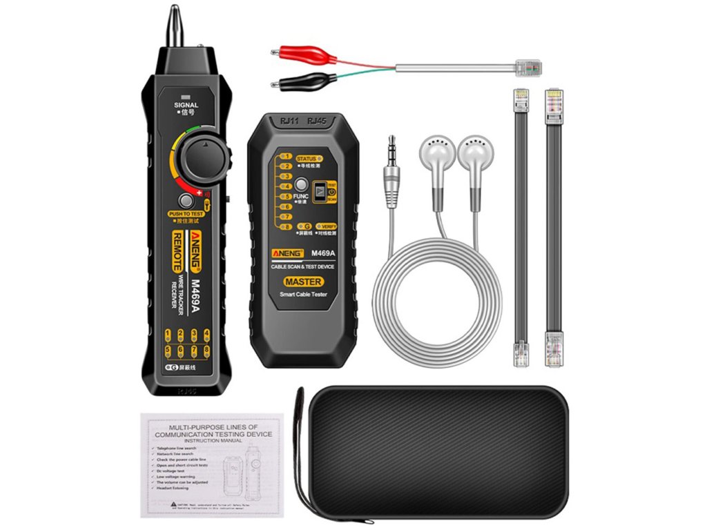 Aneng M469A je multifunkční analyzátor síťových kabelů, který umožňuje snadné testování a diagnostiku kabeláže typu RJ45 (Ethernet) i RJ11 (telefonní). Přístroj dokáže ověřit správné zapojení vodičů, zjistit zkraty, přerušení, křížení i jiné chyby. Díky jasným LED indikátorům poskytuje rychlou vizuální kontrolu zapojení, což jej činí ideálním pomocníkem při instalaci i údržbě datových a telefonních sítí.