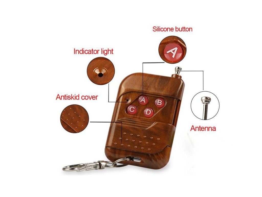 Jednoduchý kapesní vysílač s čtyřmi kanály pro komunikaci po frekvenci 433MHz. Výborně se hodí pro ovládání elektrických bran, vrat od garáže a nebo elektrických závěsů. Dosah signálu může v ideálních podmínkách dosahovat až 100m. Vysílač má vlastní anténu, kterou je možné vysunou a zasunout, plastový slider pro zakrytí tlačítek, aby se omylem nezmáčkla, když je ovládání třeba v kapse a červenou indikační diodu.