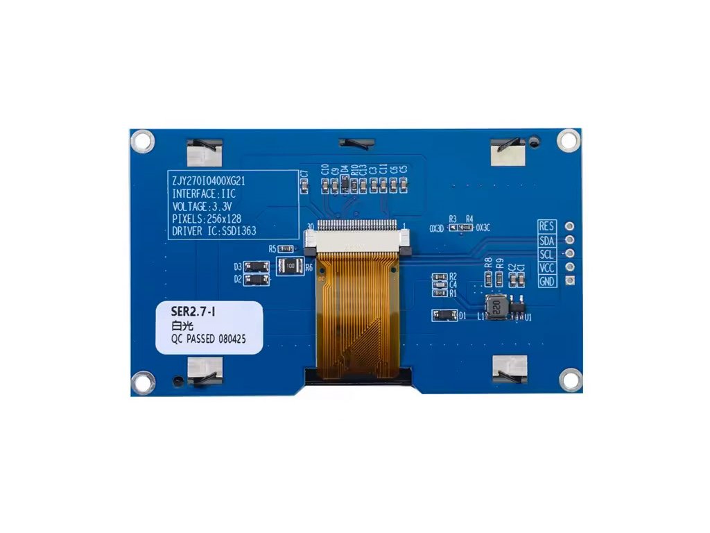 Large OLED display with a diagonal of 2.7" and a high resolution of 256×128 pixels, communicating via a two-wire I²C interface. It offers a bright white image on a deep black background, high contrast, a wide viewing angle and very low energy consumption.