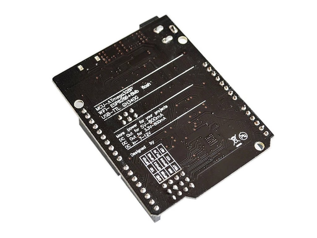 Modified version of the classic Arduino Uno rev. 3 board with full integration of the ATmega328 microcontroller and IO ESP8266 with 32MB flash memory and CH340G USB-TTL converter. All modules can work together or independently.
