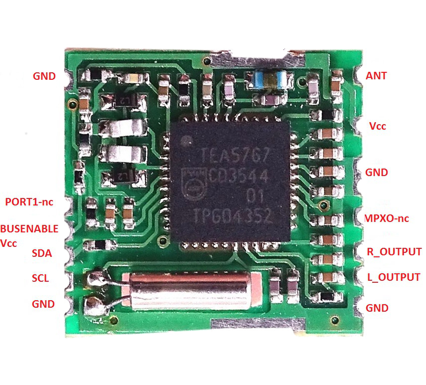 Miniature complete DSP radio receiver module for FM (86-106MHz). It is equipped with a TEA5767 integrated circuit - ideal for building a simple digitally controlled radio with Arduino. You connect only two outputs for communication with Arduino, power supply, output to the amplifier (headphones) and a piece of wire as an antenna.