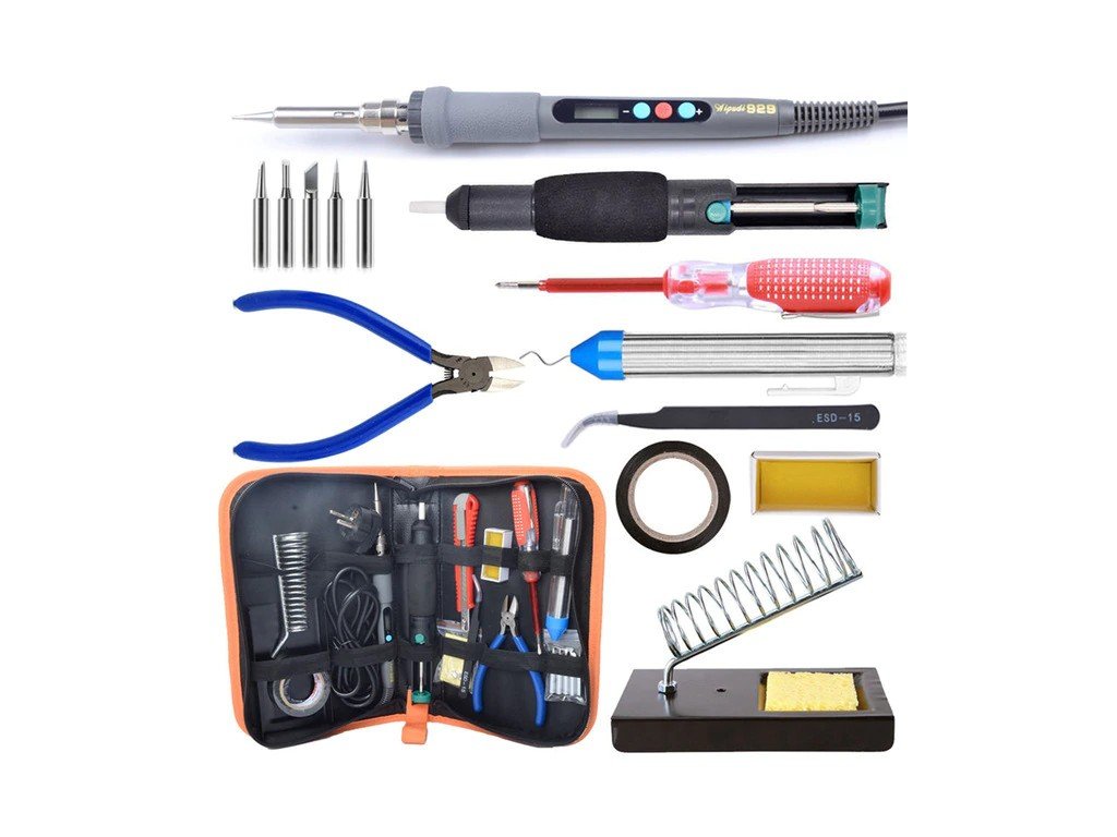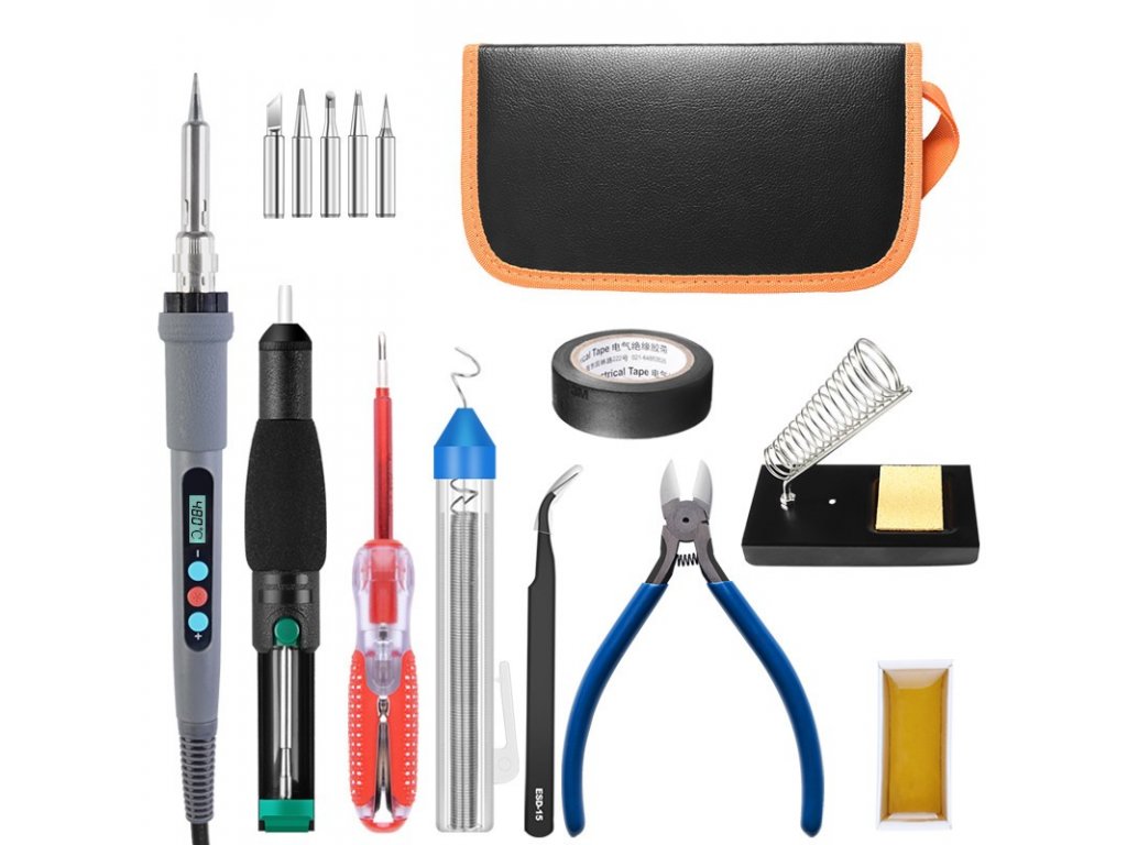 The set includes: microsolder 90W 230V with stand, 5 tips, tin extractor, tin tube coil, screwdriver - 230V phase, small cutters, tweezers, and zippered tool case. A total of 14 tools