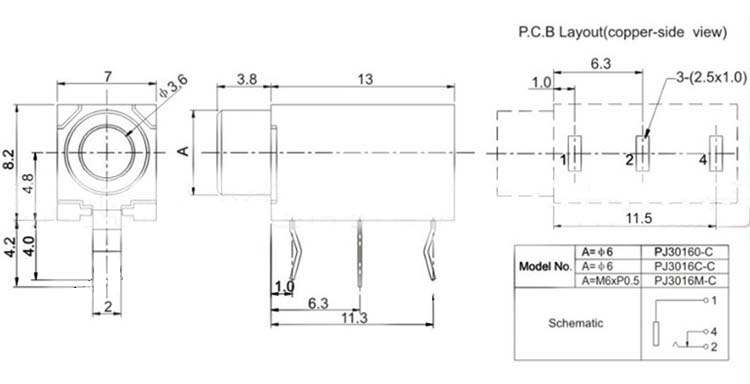 Jack connector 3.5 mm female mono 2 poles, THT to PCB