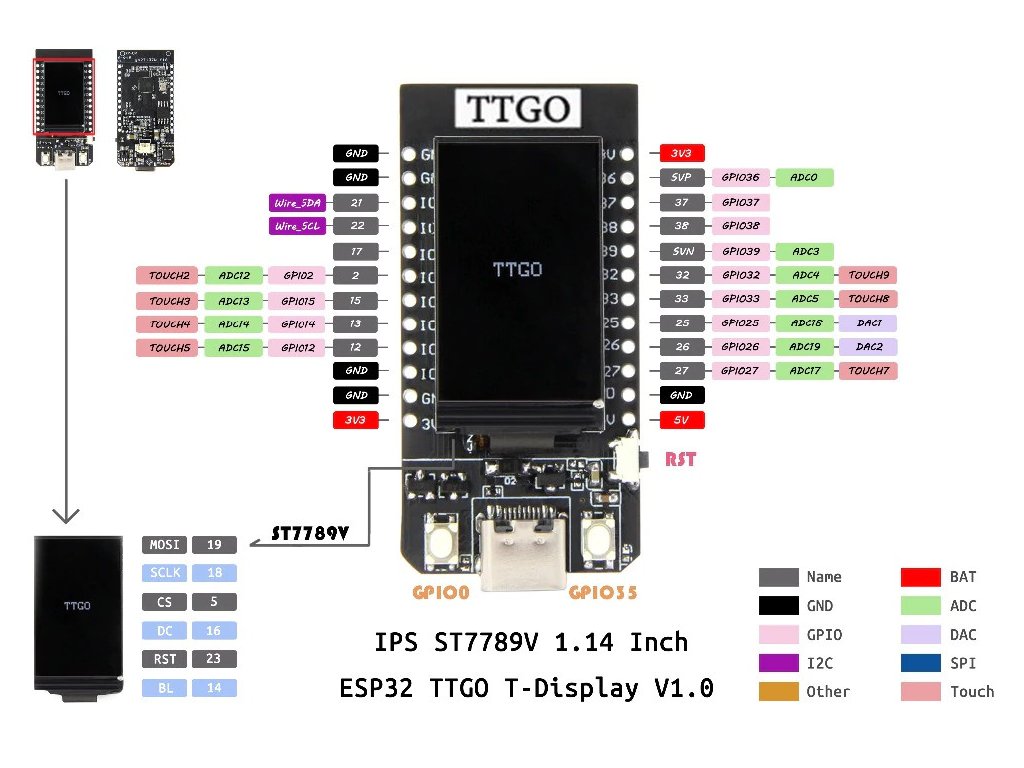 Board from LilyGO TTGO with a color TFT display based on an ESP32 chip with the possibility of wireless communication via bluetooth and WiFi.