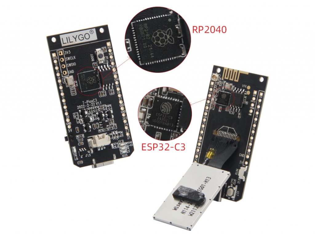 T-PicoC3 is the first LILYGO® motherboard with two MCUs (Note: Both chips can work simultaneously). Equipped with Raspberry Pi RP2040 and ESP32-C3 chip (supporting WIFI and Bluetooth).