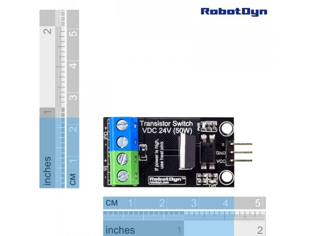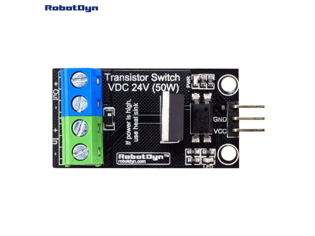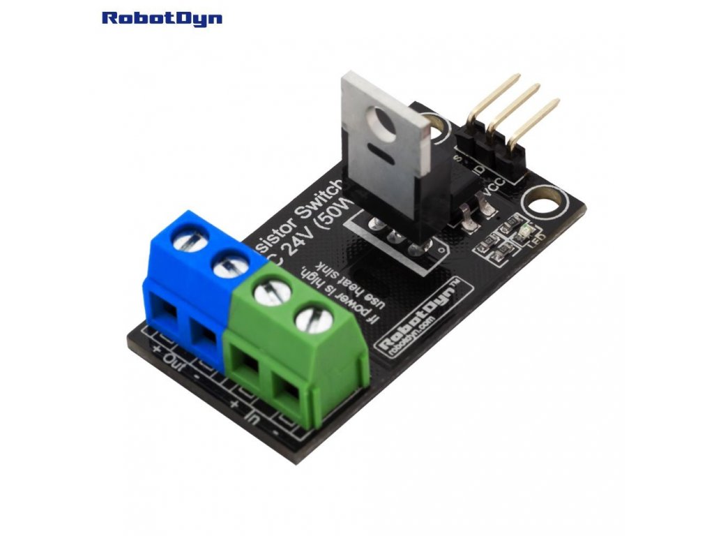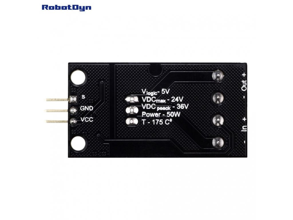 Single channel power supply module based on MOSFET transistor. The module is suitable for switching circuits requiring a power supply with higher current efficiency and higher voltage than a conventional transistor. Mosfet transistors can switch more power faster and more efficiently than relays or N or P channel transistors. It is ideal for power circuits, motor controllers and lighting circuits.