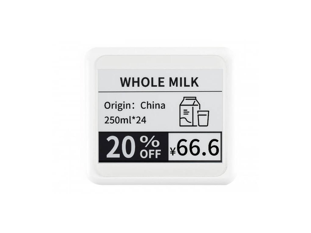 The display module is encapsulated in a handy box with panel mounts on the back. No power supply or data connection is needed to run and change content. Both power and data communication is via built-in NFC wireless technology. Thanks to this, it can be used e.g. as a price tag in shops, a label in a warehouse, a name tag, etc.