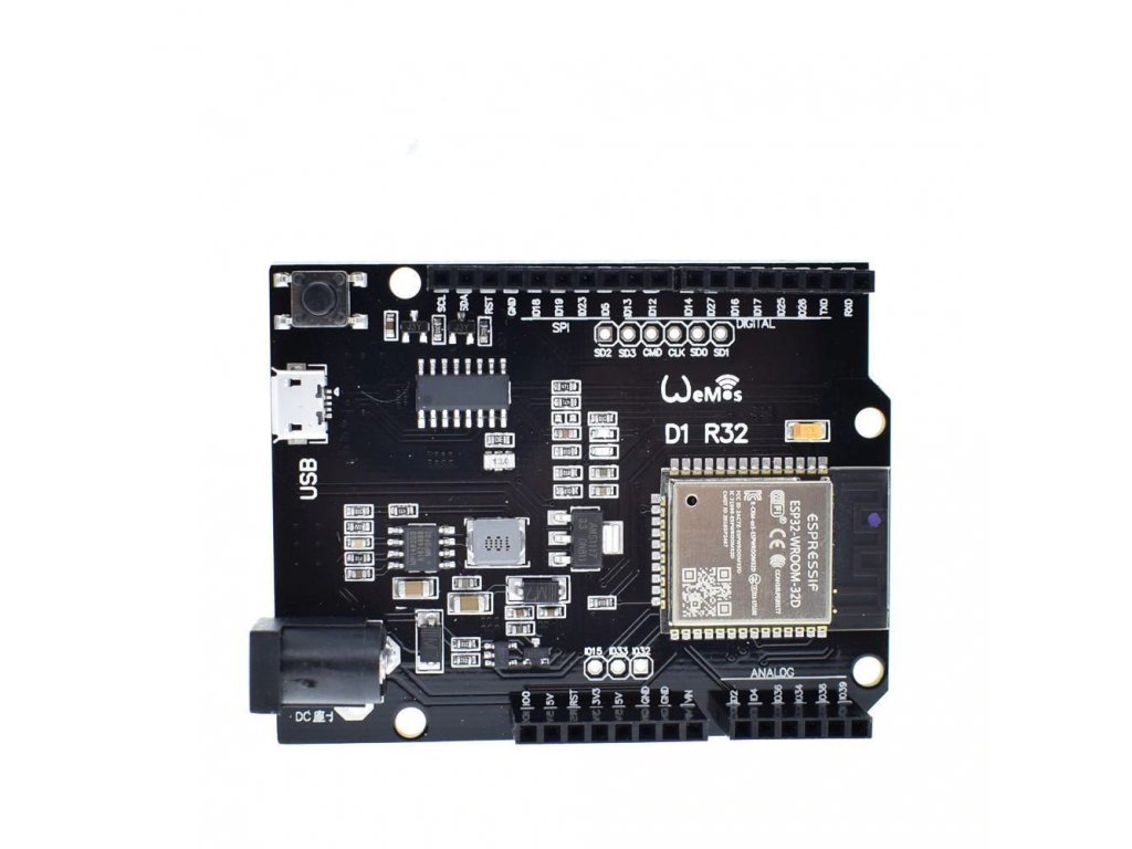 Board integrating wireless WiFi module with ESP-32 chip) and also USB interface from which the module can be powered and programmed. Communication is provided by the CH340 controller. The ESP-32 module itself is equipped with a highly integrated and powerful 32-bit microprocessor with many GPIO pins, that can perform the action according to the programmed code even without using the Arduino control.