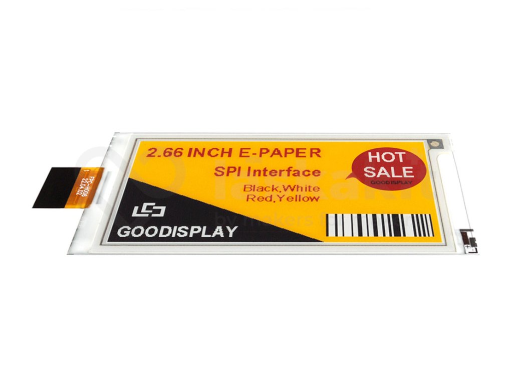 Jedná se o elektronický papírový displej 2.66 palců s rozlišením 360x184, rozhraním SPI a možností zobrazovat 4 barevný obrázky, loga, ikony. Obrázek, který zobrazíš, vydrží neomezeně dlouho bez napájení - zobraz obrázek a pak vypni napájení. Jakmile jsou tyto moduly displeje elektronického papíru aktualizovány, nevyžadují žádné napájení a lze je vlastně zcela odpojit a obsah zůstane na displeji po neomezenou dobu. Tento ePaper displej je ideální pro zařízení s nízkou spotřebou energie napájený ze solárních zdrojů nebo baterií.