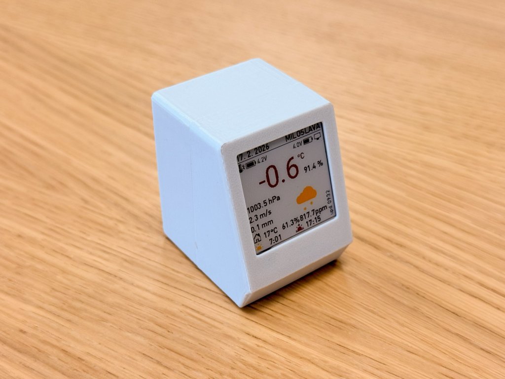 Celou měřící stanici obsluhuje LaskaKit microESPink ESP32-S3-MINI e-Paper. Na této malé desce je čip ESP32-S3-MINI podporující Wi-Fi a Bluetooth připojení, možnost připojení baterie, I2C čidla díky našemu uŠup konektoru.