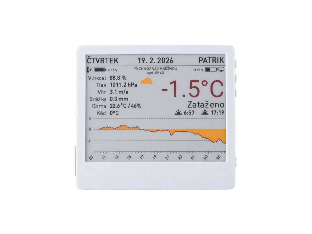 Sestav si vlastní "Živý obraz"! Získej chytrý e-Paper displej, který přes Wi-Fi komunikuje se serverem služby Živý obraz a dostaneš na něj díky tomu takřka libovolné informace. Součástí stavebnice je i silná baterie, která v závislosti na četnosti přepisu vydrží od týdnů až po roky provozu.