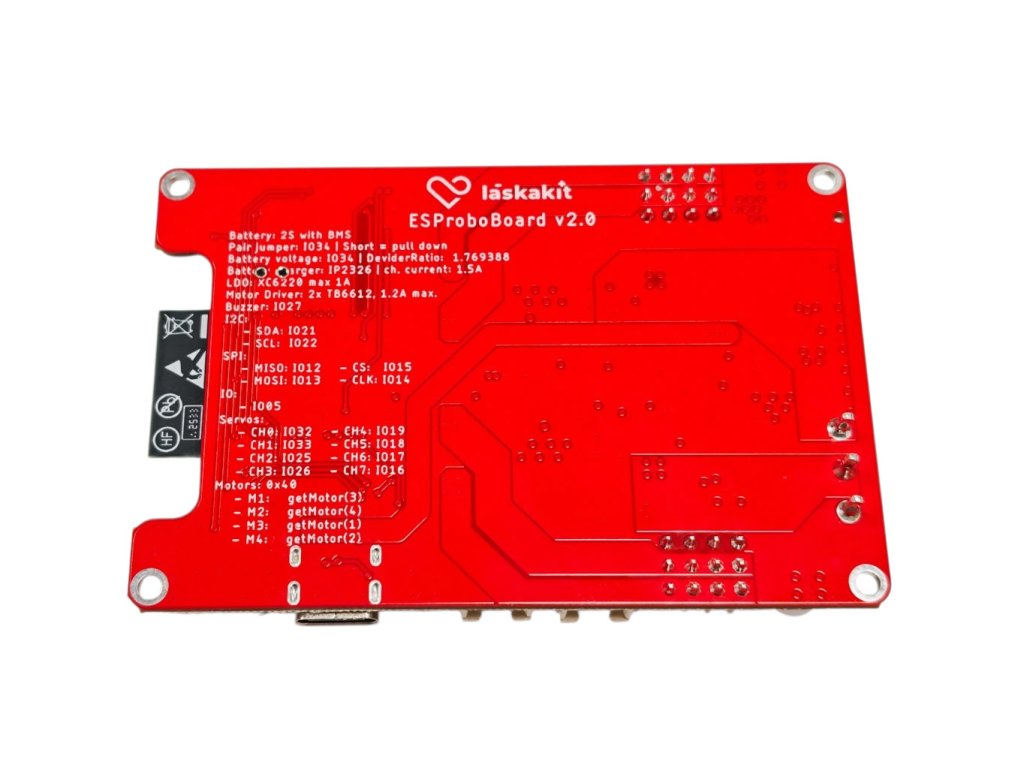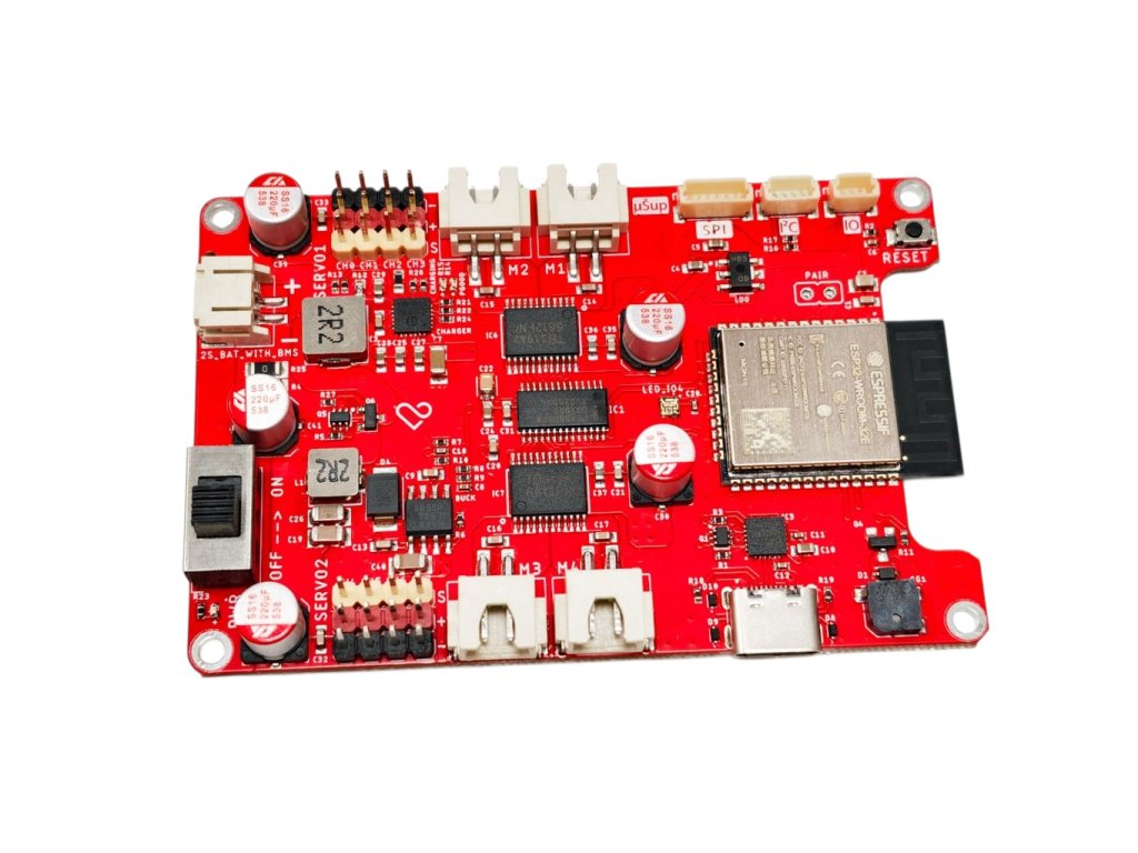 RoboBoard-ESP32 (V2) je kompaktní deska pro stavbu robotů s ESP32, která má už na sobě to nejdůležitější: řízení až 4 DC motorů, výstupy pro až 8 serv, integrovaný USB-C programátor, I2C/SPI/IO konektory uŠup a navíc vylepšené napájení – včetně nabíjení 2S Li-Pol přímo přes USB-C, ochrany a stavové RGB LED. Díky tomu je ideální pro první robotické projekty i pro pozdější rozšiřování o další senzory, displeje a moduly.