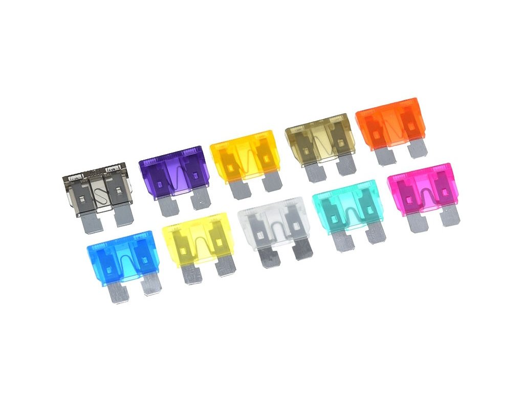 Praktické uzavíratelné balení automobilových nožových pojistek. Celkem 50 pojistek v přehledném, přihrádkami opatřeném kufříku.