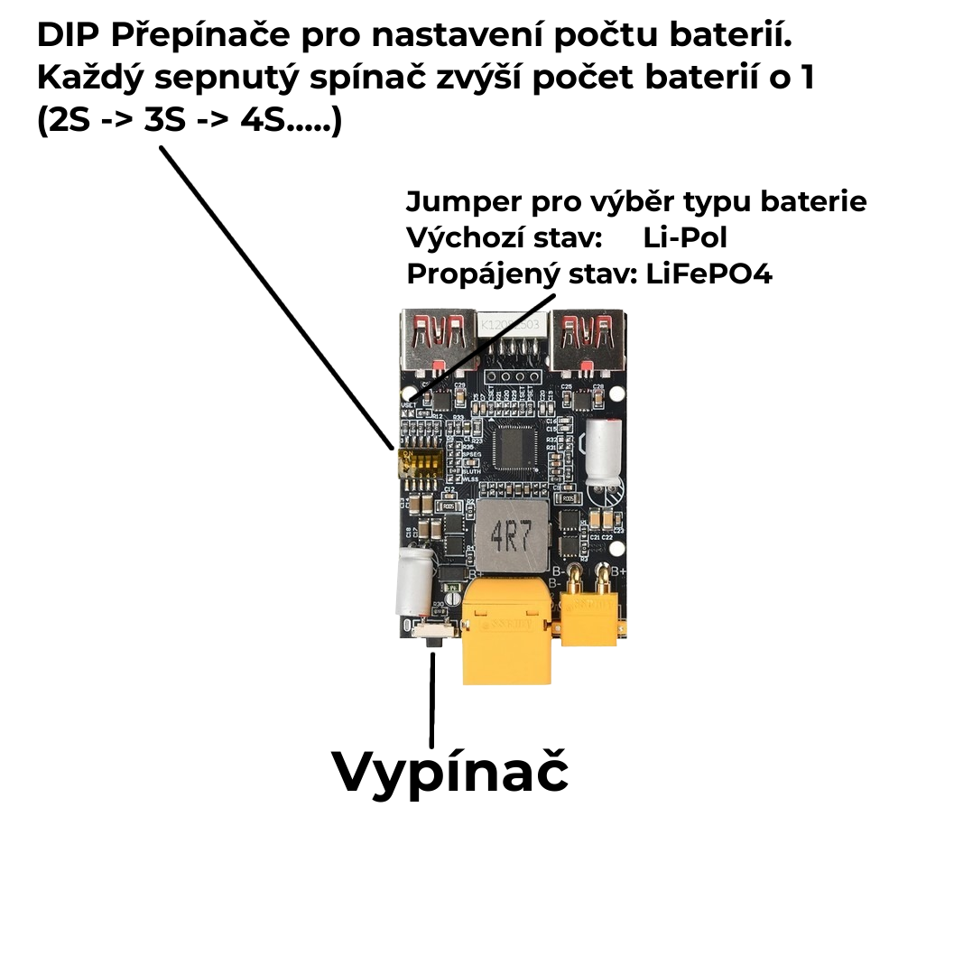 - Baterie: Používejte pouze kvalitní bateriové články s dostatečnou proudovou zatížitelností a s BMS.
