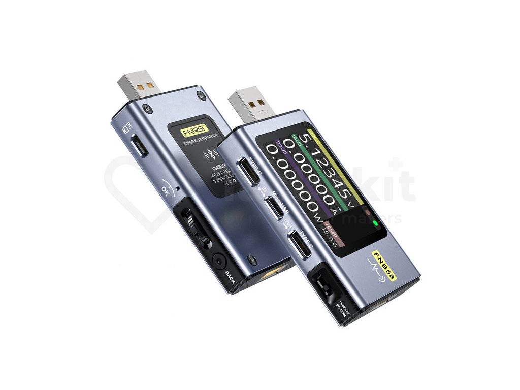 Tester FNB58 je vysoce spolehlivé a bezpečné USB zařízení umožňující měření proudu a detekci protokolu rychlého nabíjení mobilních zařízení. Má 2" TFT LCD displej a integrována rozhraní USB-A, microUSB a USB-C. Pro měření používá externí 16bitový ADC převodník a samostatný obvod rychlého nabíjení PD. Lze jej použít k měření napájení nebo spotřeby energie produktů s USB rozhraním, jako jsou nabíječky mobilních telefonů, U disky atd. Lze jej použít k měření nabíjecího výkonu nabíječek mobilních telefonů a podmínek vstupu a výstupu nabíjení mobilních zařízení. Detekuje protokoly rychlého nabíjení APPLE2.4A, QC2.0, QC3.0, PD, Samsung AFC, FCP, SCP, VOOC/WARP, Supervooc, MTK-PE.