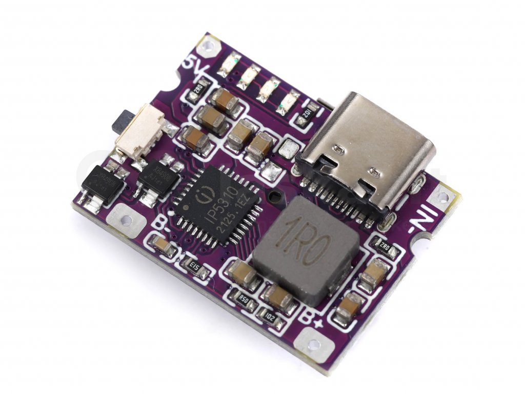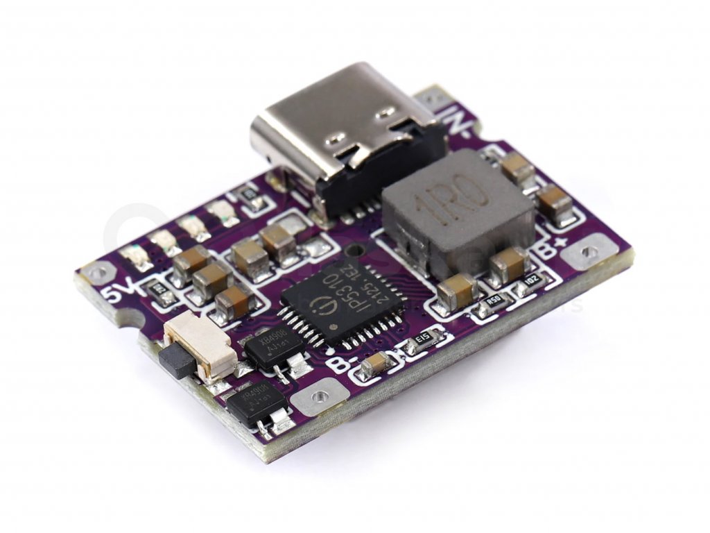 Nabíjení baterie lze provádět pomocí USB-C konektoru, nebo přivedením napětí 5V na pájecí plošky 5V(+) a IN-(-). Nabíjecí proud je v případě použití USB-C konektoru až 3A. V případě použití pájecích plošek je možné použít nabíjecí proud jen 2A.