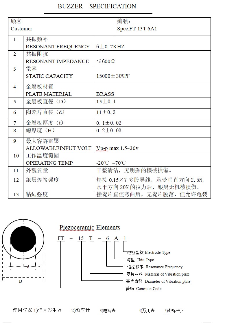 Piezo měnič FT-15T-6.0A1-C11 15mm 6kHz, pasivní