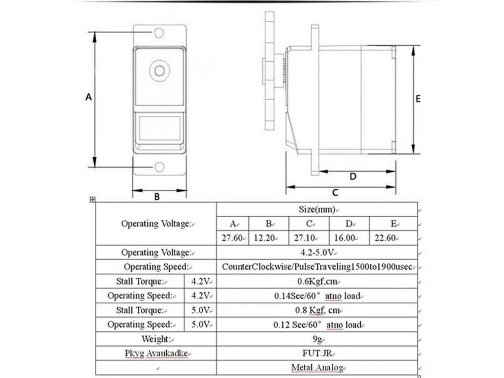- Rychlost: 0.14s/60° (4.2V), 0.12s/60° (5.0V)
