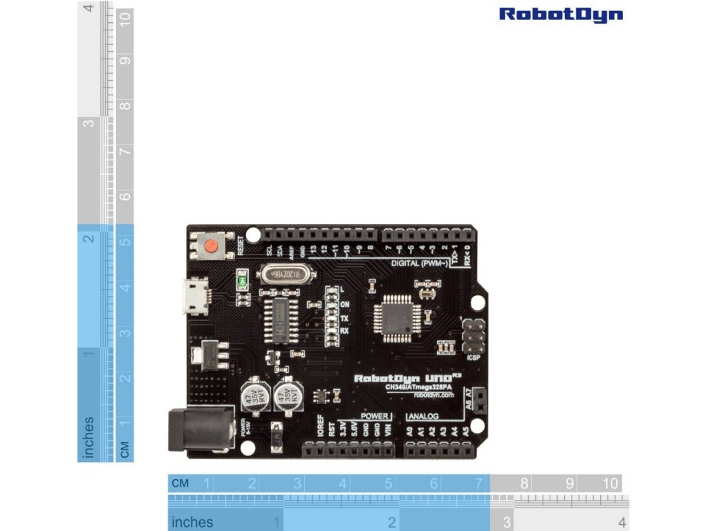 - Deska má stejné rozměry a rozložení vstupních/výstupních konektorů jako originální Arduino UNO R3