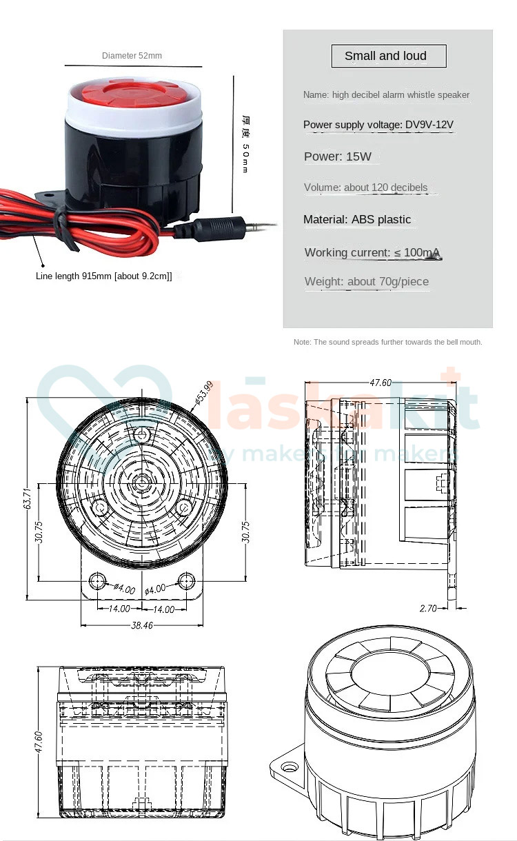 Piezoelektrická siréna SA-105 je kompaktní zvukový alarm s vysokou hlasitostí, určený pro bezpečnostní systémy, poplašná zařízení, nouzové signalizace a další aplikace, kde je vyžadováno výrazné zvukové upozornění. Díky piezo technologii má nízkou spotřebu energie, vysokou spolehlivost a dlouhou životnost. Montáž je snadná díky otvorům v těle sirény.