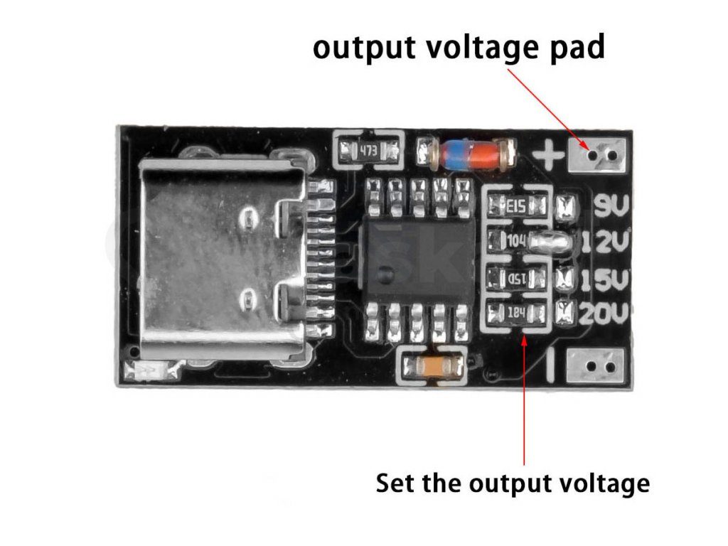 Tento přepínač umožňuje tvému zařízení napájení pomocí USB-C konektoru s podporou nabíjecího protokolu PD3.0/2.0, PPS/QC4+, QC3.0/2.0, FCP, AFC. Výstupní napětí se volí propojkou na desce. Jelikož modul neobsahuje žádný stabilizátor, nebo měnič, je maximální výstupní napětí závislé na maximálním výstupním napětí zdroje.